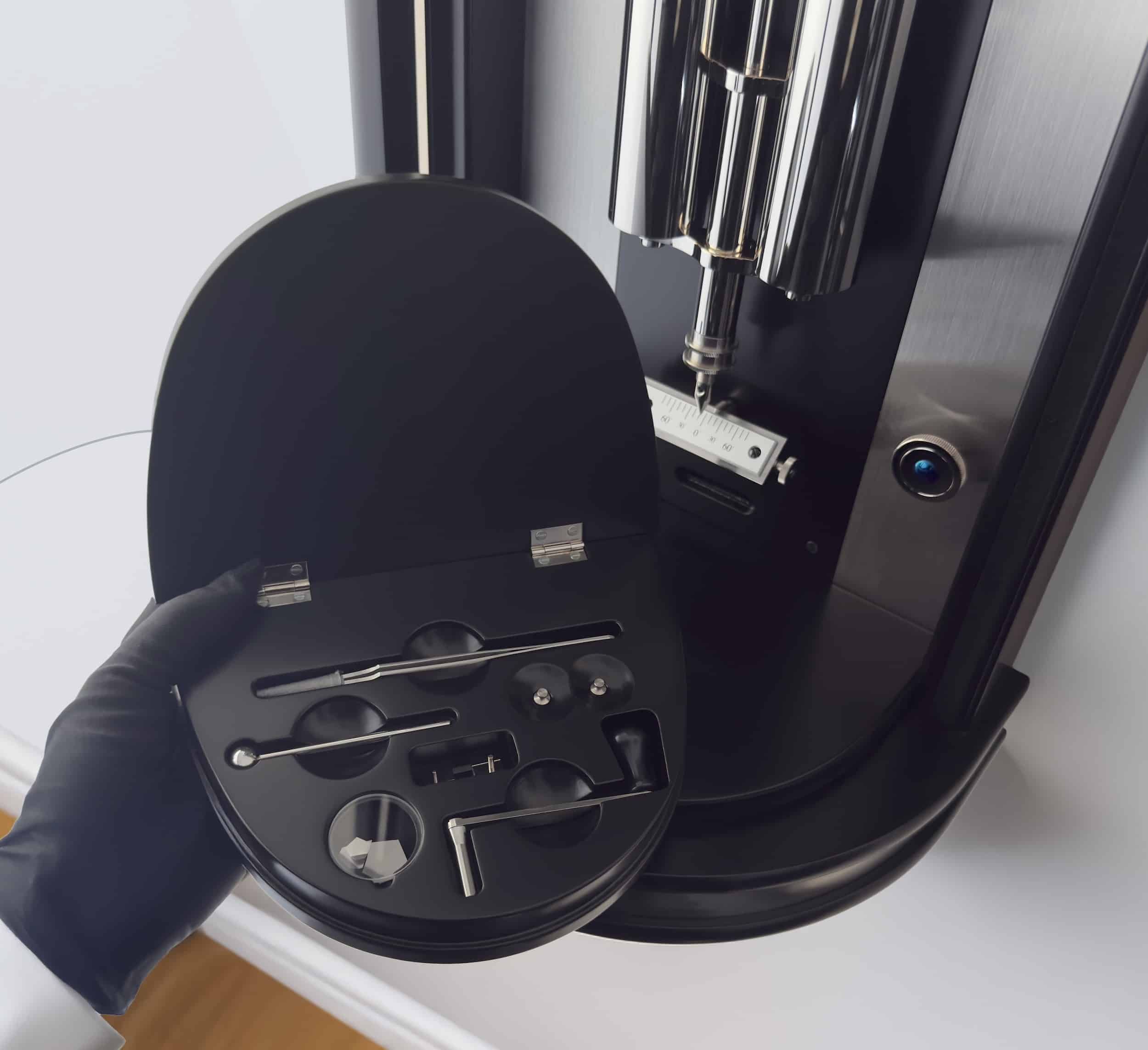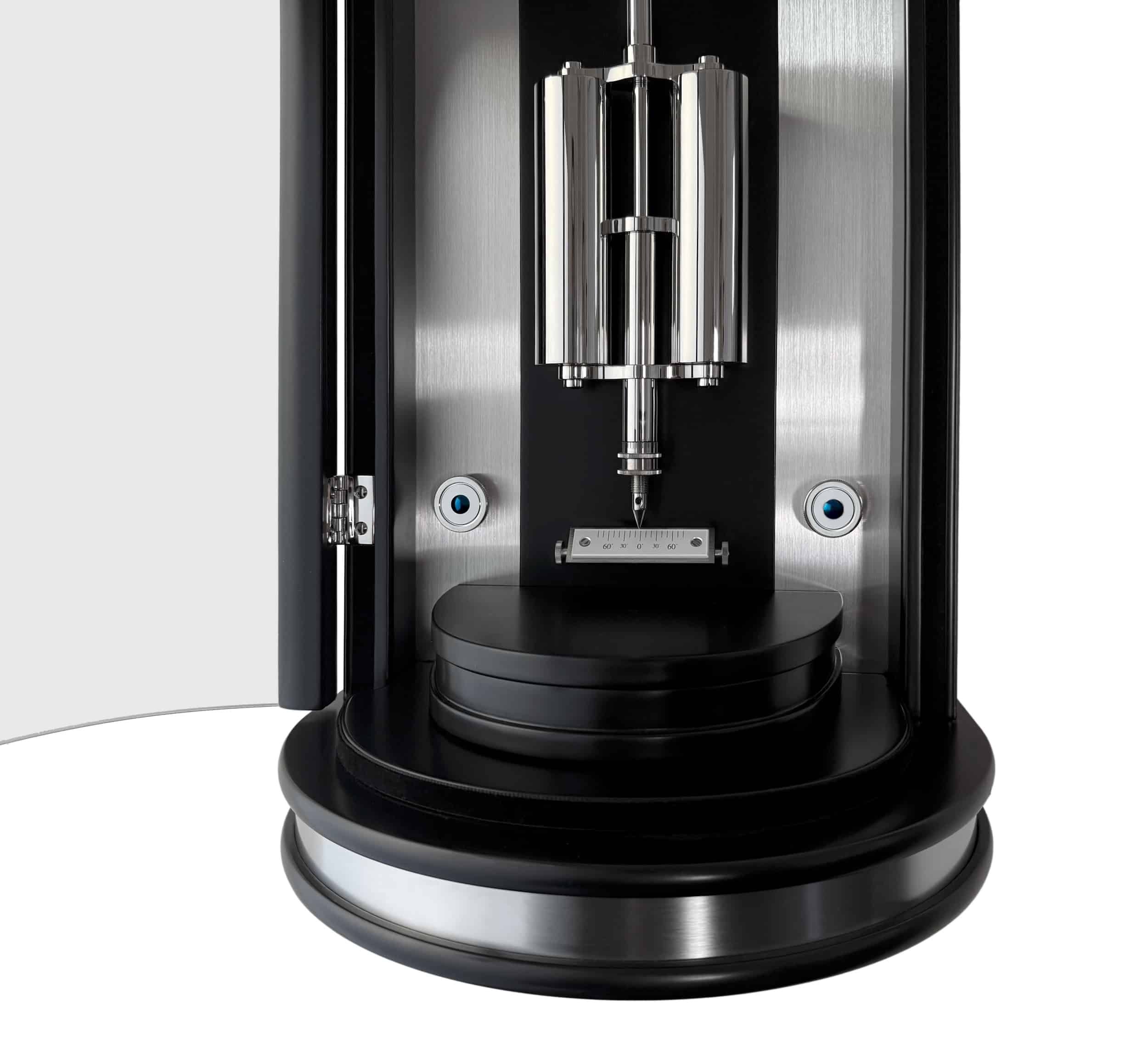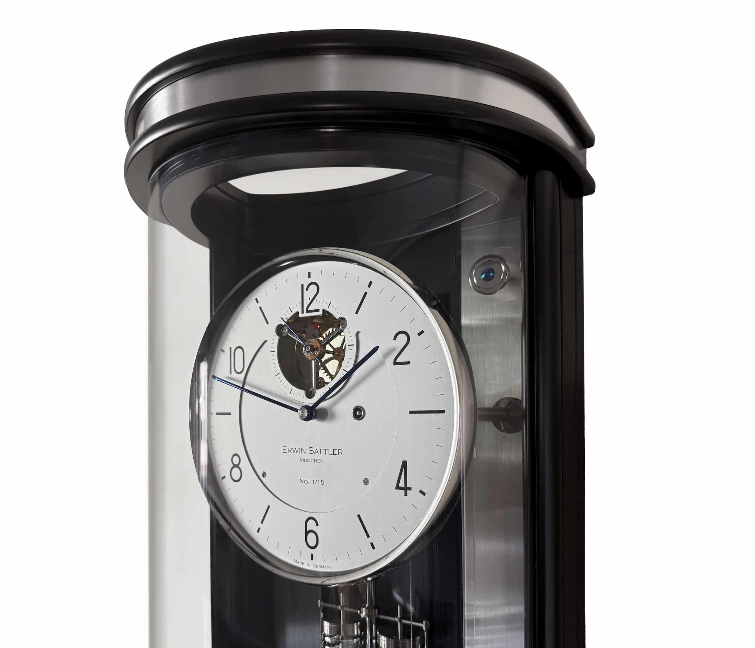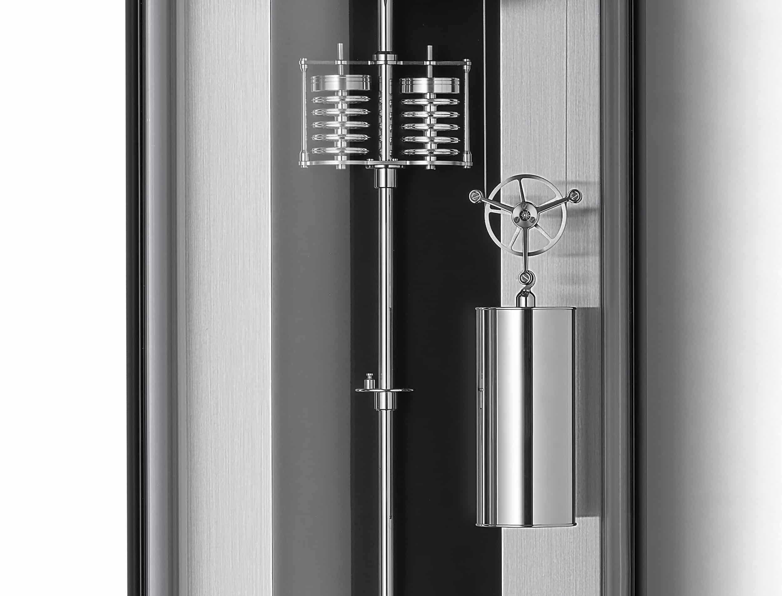 Ẩn sau thiết kế mặt số hiện đại với các chi tiết khoét mở và cầu trục bánh gai (pallet arbor bridge) được hoàn thiện thủ công là bộ máy chính xác vận hành theo chu kỳ tháng, trang bị chân kính, vòng bi cùng ngàm đá mã não (agate pallets). Dĩ nhiên, đồng hồ còn được tích hợp quả lắc bù nhiệt độ kèm cơ chế bù áp suất khí quyển.